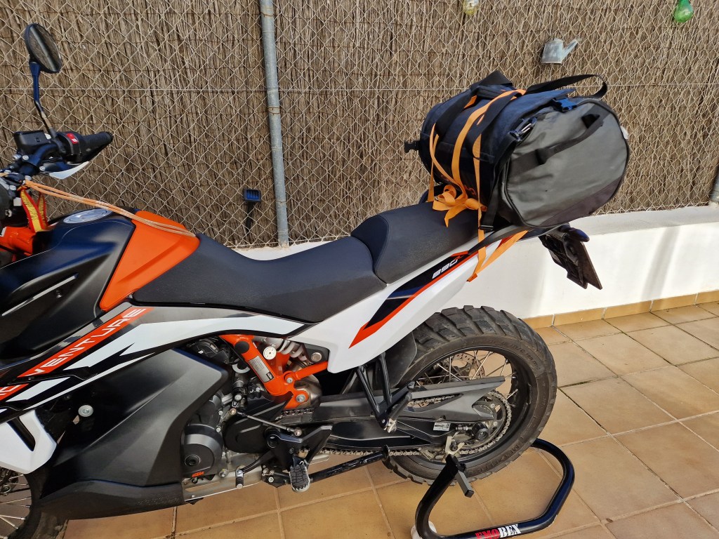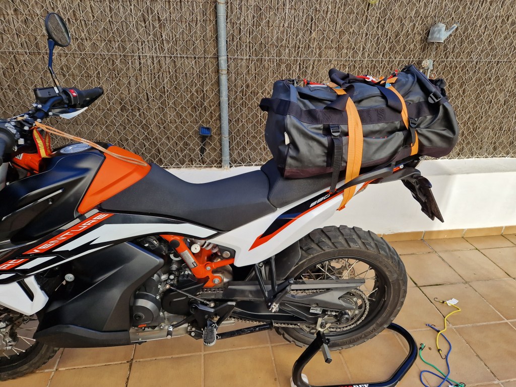 Hasta hace poco, la moto que usaba para los viajes era mi GSA del 2014 pero cuando la vendí empecé a usar la KTM 890 Adv R. Una de las cosas que más eché de menos en mi viaje a Marruecos durante las navidades pasadas fue una parrilla portaequipajes en condiciones. Las pruebas que hice, colocando la bolsa en sentido longitudinal o transversal eran porque no tenía una base ancha y dudaba sobre la mejor forma de trincar la bolsa. En sentido longitudinal: