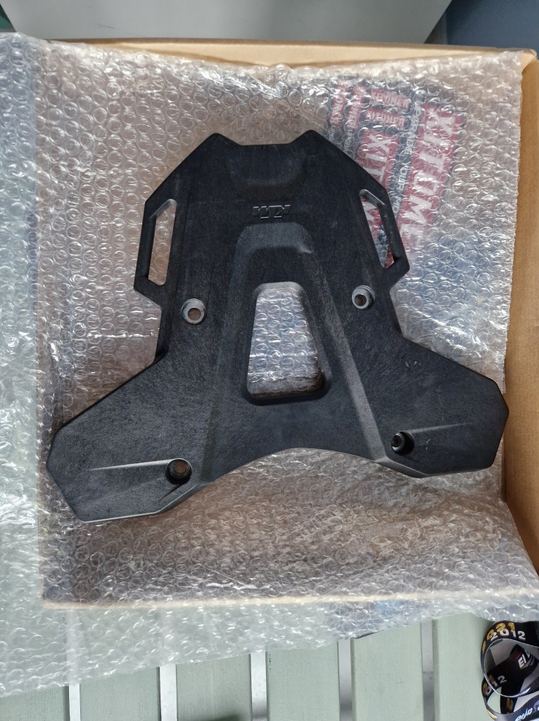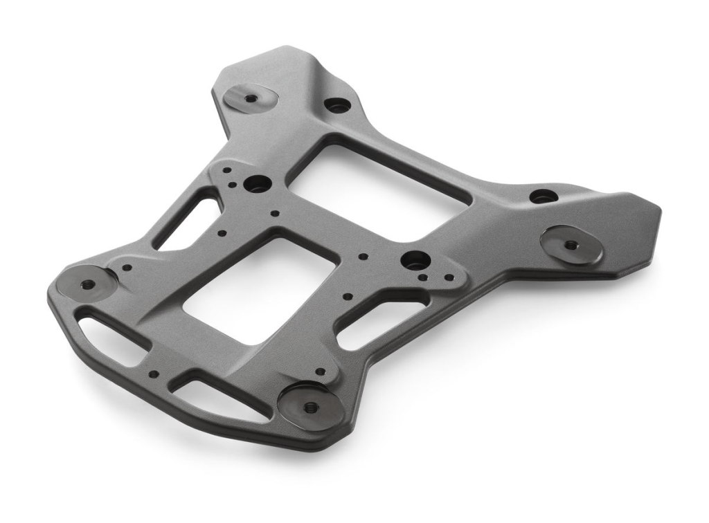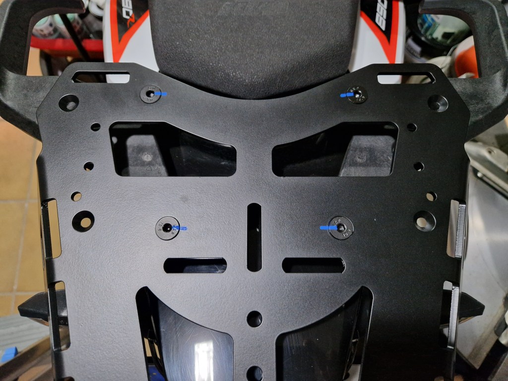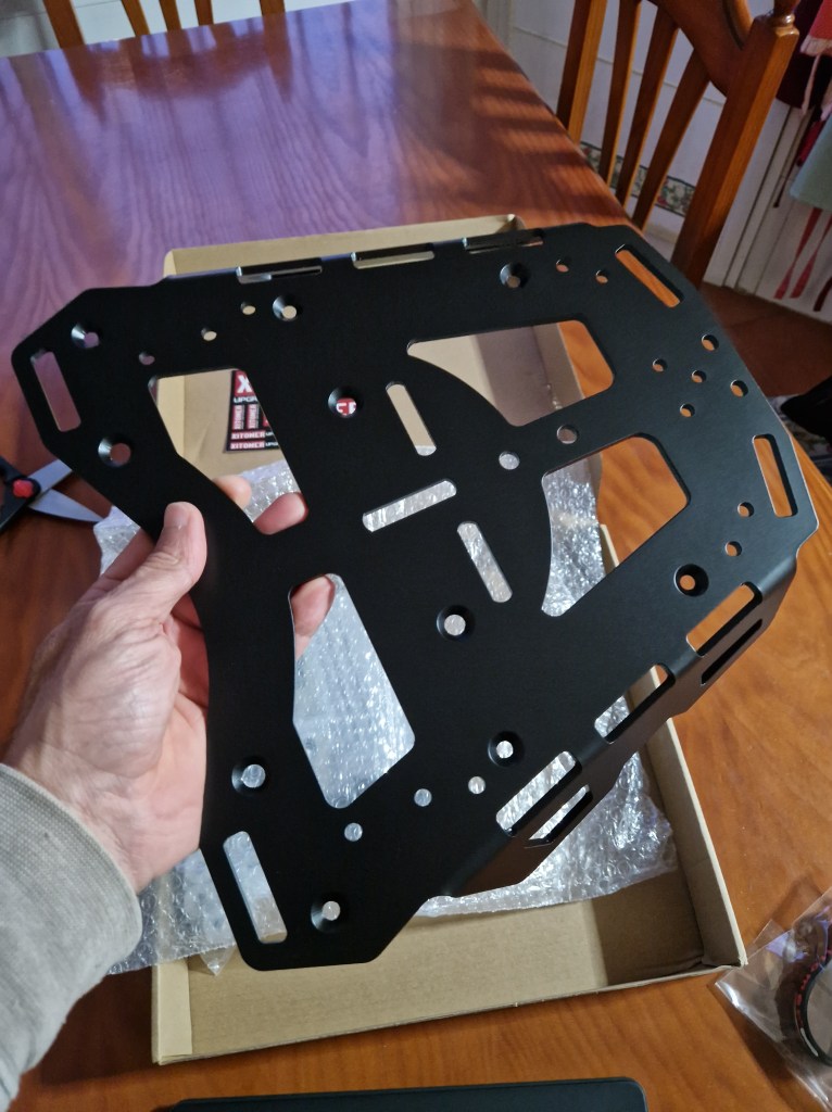 Es una base bastante ancha y larga de aluminio de 4mm de espesor con múltiples posibilidades para montar soportes de Topcase de las marcas más conocidas (y que no usaré para ello) y múltiples puntos de anclaje para cinchas y agujeros para otros accesorios: