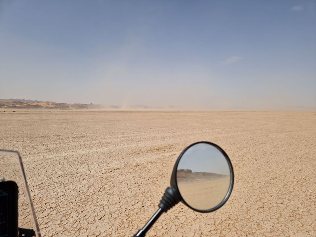 Además de las numerosas hamadas me encontré con un lago seco de superficie cuarteada y clara, yo diría que salada. Y en la foto se puede ver la tormenta de polvo que, por suerte, no me atrapo: LC8 y gas!!!!