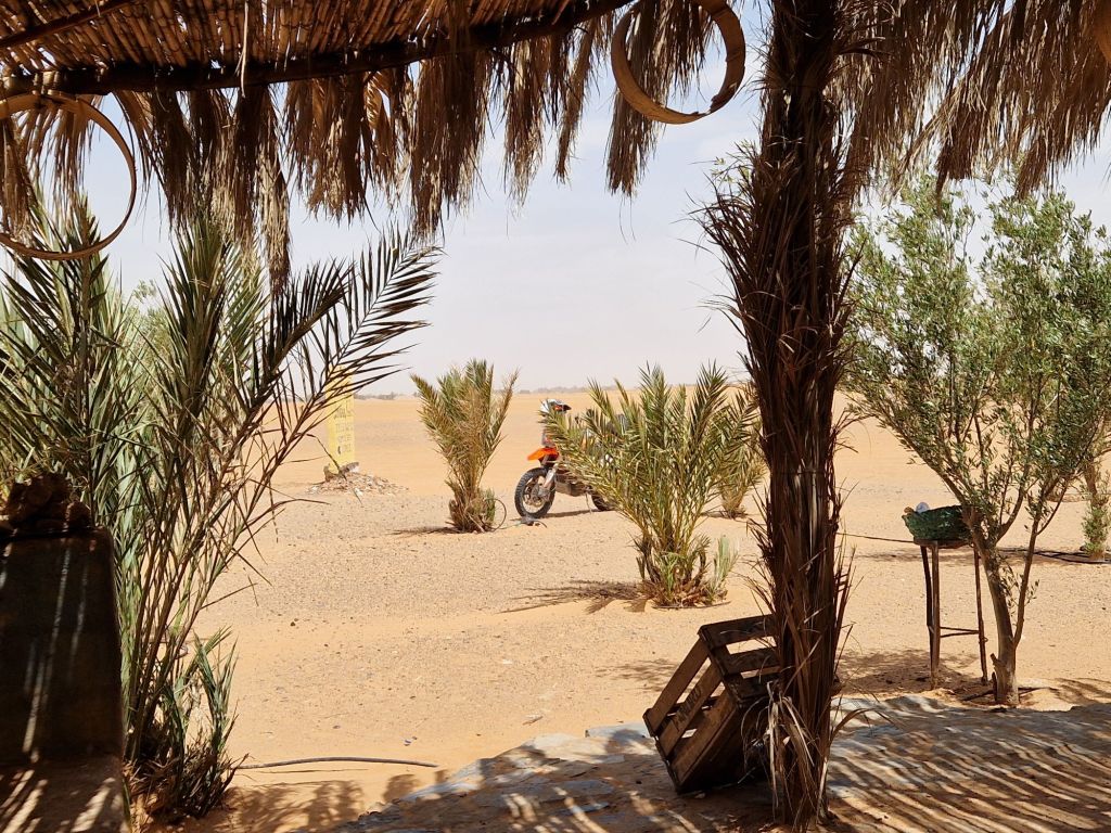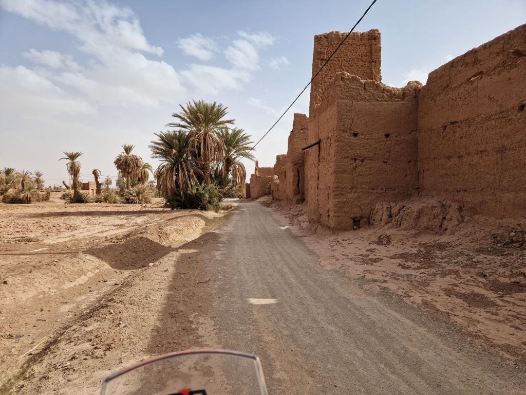 Llegando a Tagounite, dejé de seguir los GPX y me busqué un sitio para pasar la noche al que navegué con Google Mapas, pero por algún motivo decidió llevarme durante 15 km por offroad, y gracias a ello me vi en medio de un palmeral, con su Kasbah y sus huertos abandonados
