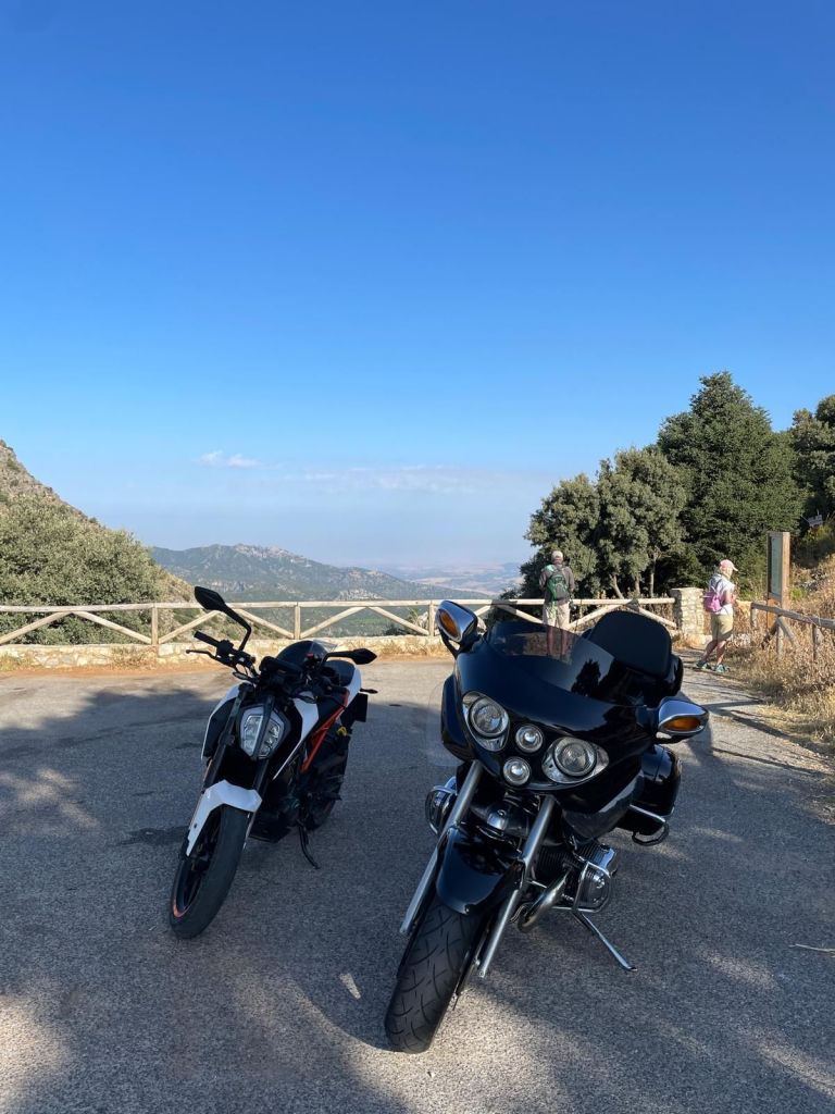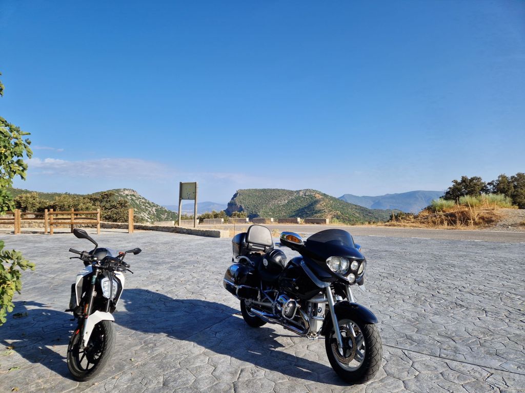 David pesa 125kg, tiene 15cv y unos 11Nm. Goliat pesa más de 300kg, tiene 90cv y casi 100Nm. David está diseñada como una deportiva R y Goliat es una Cruiser en toda regla. David es una KTM 125 Duke y Goliat es mi BMW R1200 CLC. Sin embargo, hace unos días David y Goliat salieron juntas por las reviradísimas curvas de los puertos de montaña de la Sierra de Cádiz y se lo pasaron estupendamente (y sus dueños también).