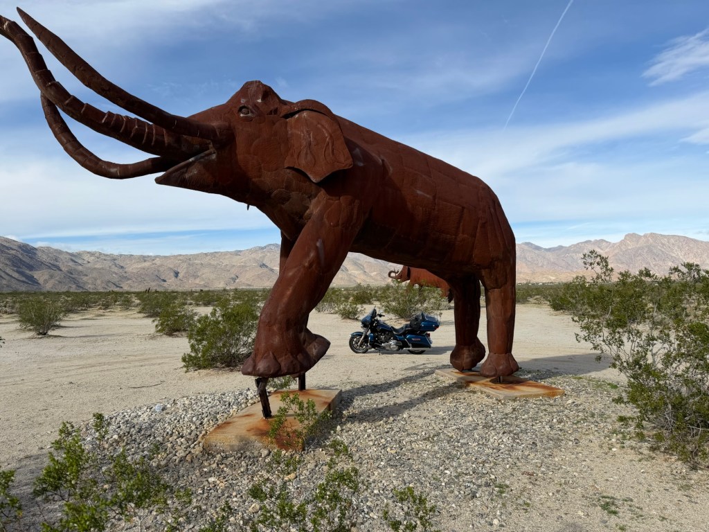El desierto de Borrego Springs se encuentra en el Parque Estatal del desierto de Anza-Borrego, una vasta superficie de típico desierto californiano, no de dunas de arena, en las que abundan las pistas de arena y grava que harían las delicias de mi KTM.